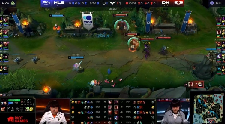 【33:55】DK开大龙,Zeka酒桶绕后大招炸散四个,但是ShowMaker安妮正好抓住机会大招砸中Kingen杰斯!将其秒掉之后Canyon盲僧又来关键一脚命中Viper女警!失去上下两大输出点的HLE无力防守,DK打出0换3之后Canyon盲僧拖住Zeka回城,DK从中路一波结束首局比赛!